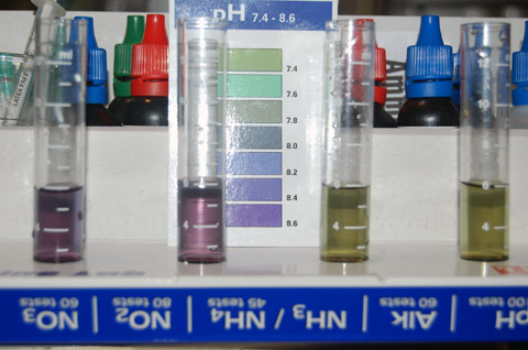 昨夜、魚水槽と珊瑚水槽の両方のPHとNo2、No3を測ってみました。